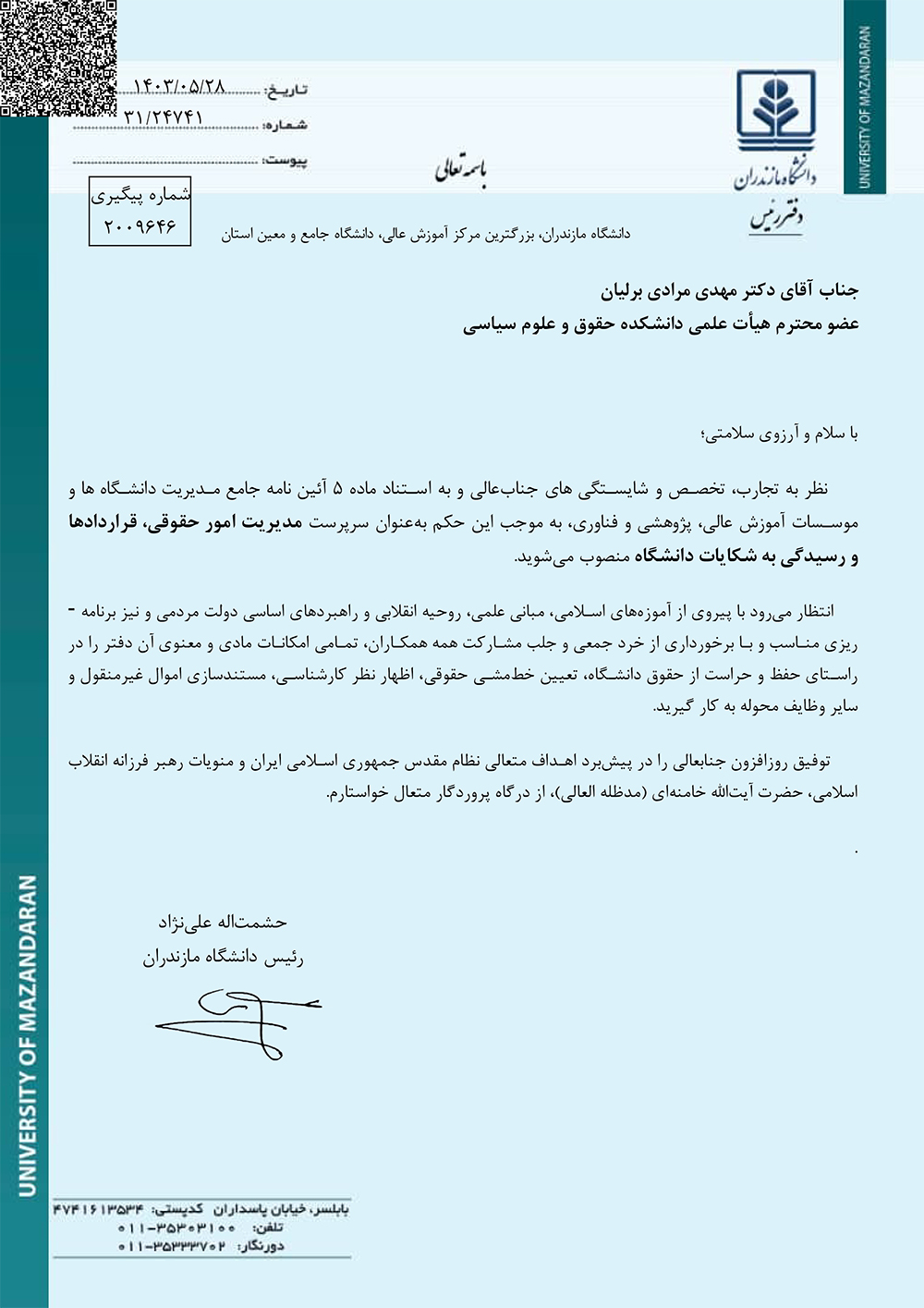 به گزارش روابط عمومی دانشگاه مازندران، دکتر حشمتالله علینژاد رییس دانشگاه، با صدور احکام جداگانهای، دکتر علیاکبر جعفری و دکتر مهدی مرادی برلیان اعضای هیات علمی دانشکده حقوق و علوم سیاسی را به ترتیب بهعنوان سرپرست دانشکده حقوق و علوم سیاسی و سرپرست مدیریت امور حقوقی، قراردادها و رسیدگی به شکایات دانشگاه مازندران منصوب کرد.