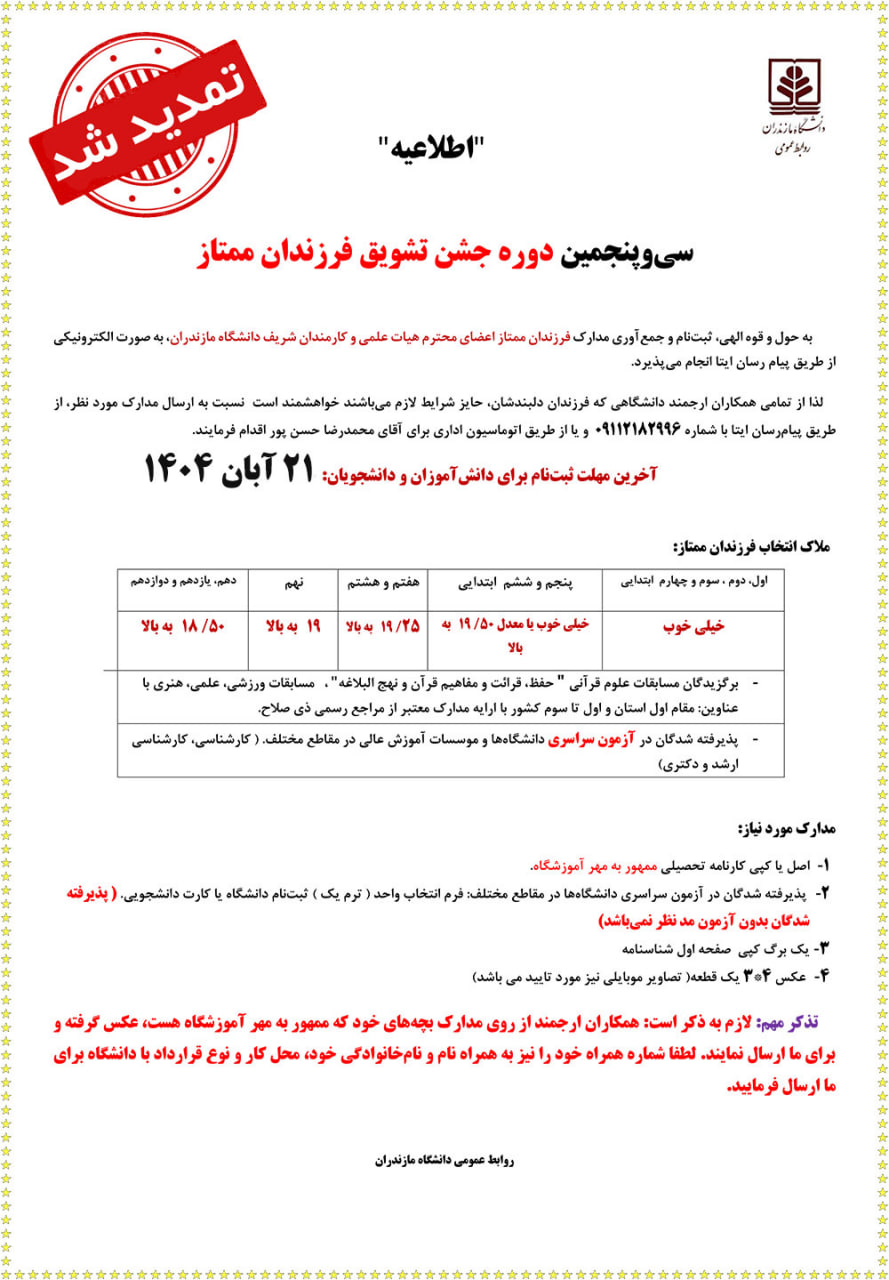 تمدید زمان جمعآوری مدارک سیوپنجمین دوره جشن تشویق فرزندان ممتاز - دانشگاه مازندران