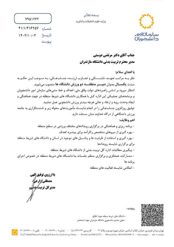 به گزارش روابط عمومی دانشگاه مازندران، طی حکمی از سوی دکتر مصطفی زارعی مدیر کل تربیت بدنی وزارت علوم، تحقیقات و فناوری، دکتر مرتضی دوستی مدیر تربیت بدنی دانشگاه مازندران، به مدت یکسال به عنوان دبیر منطقه دو ورزش دانشگاهها منصوب شد.